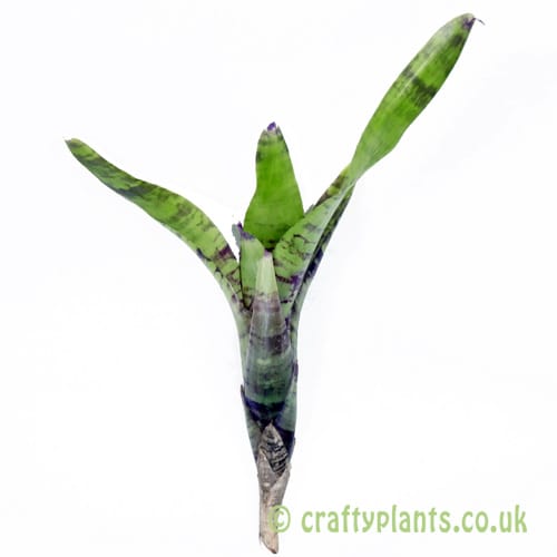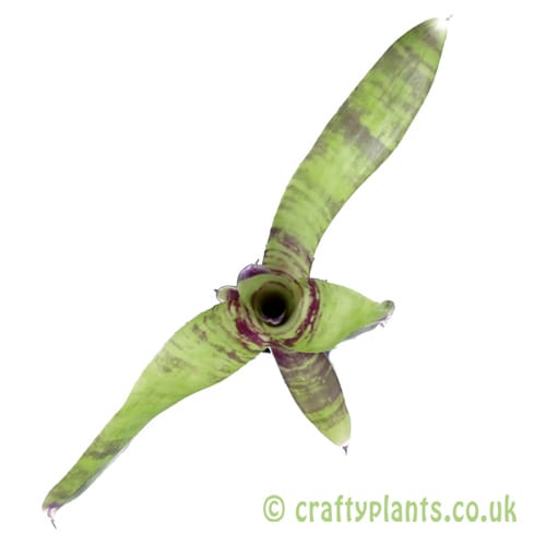Neoregelias are low growing, compact plants whose structure is similar to many of the tank bromeliads. Their leaves are arranged in a circular pattern around the dentral set which form a ‘tank’ or holding reservoir that serves to collect water and debris to sustain the plant. When growing indoors, the water in this tank must be changed at regular intervals to avoid it becoming stagnant. They prefer bright lighting conditions, however direct sunlight can scorch and bleach the leaves, so diffused or indirect light is best. Plants with tough plain-green leaves will tolerate more sun than those with paler, coloured or variegated leaves. Similarly to Tillandsia, Neoregelias will tolerate a variety of temperatures, but will not survive below 10 degrees celsius. Temperatures in excess of 30 degrees will lead to poor colouration of leaves.
