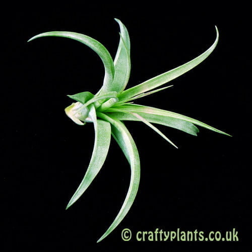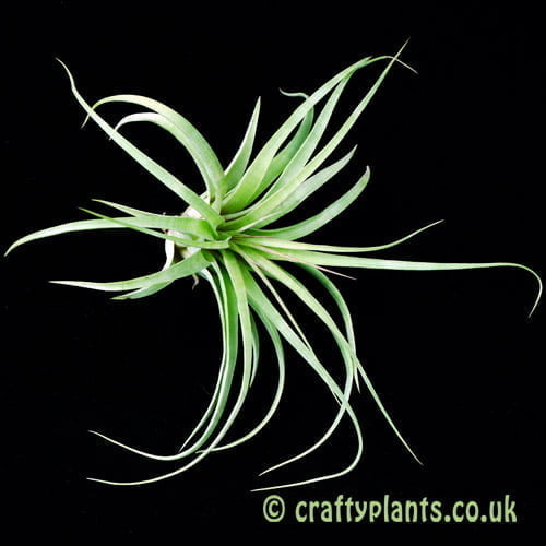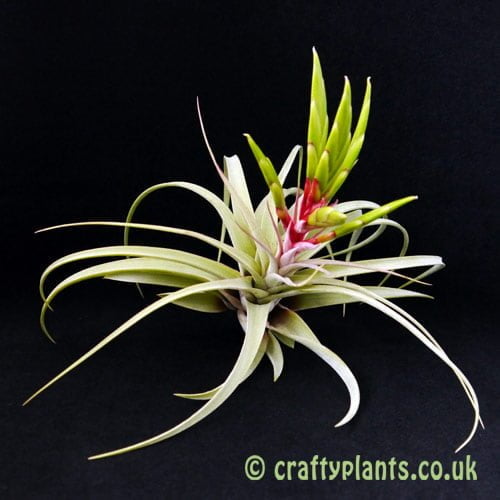 A real showpiece in any collection, Tillandsia ‘Redy’ has got to be one of the most eye catching hybrid air plants. The aim with any hybrid is to bring together the best features of both parents and Tillandsia ‘Redy’ does just that! Combining the more succulent recurving leaves of Tillandsia streptophylla, slightly stiffened and straightened by the Tillandsia concolor genes, this creates a truly impressive plant. As if its sculptured shape isn’t enough, when ‘Redy’ comes to flowering, this kid even manages to top both of its parents! The fantastically coloured, well branched inflorescence can last for months as relatively short lived tubular purple flowers are produced in succession.